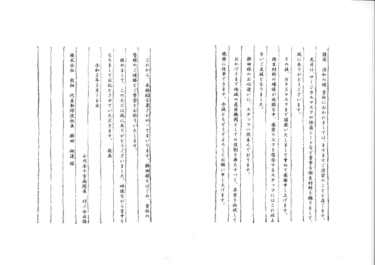 そして、その旨は4月30日のニュースでもお知らせさせて頂きましたが、この度、寄付をしたすべての医療機関様より感謝状を頂戴しました。