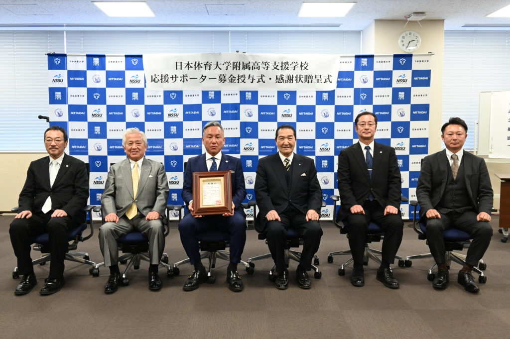 また、2025年12月12日、東京都世田谷区 日本体育大学にて、「日本体育大学附属高等支援学校 応援サポーター募金 感謝状贈呈式」が執り行われ、松浪健四郎 理事長より感謝状を拝受いたしました。
