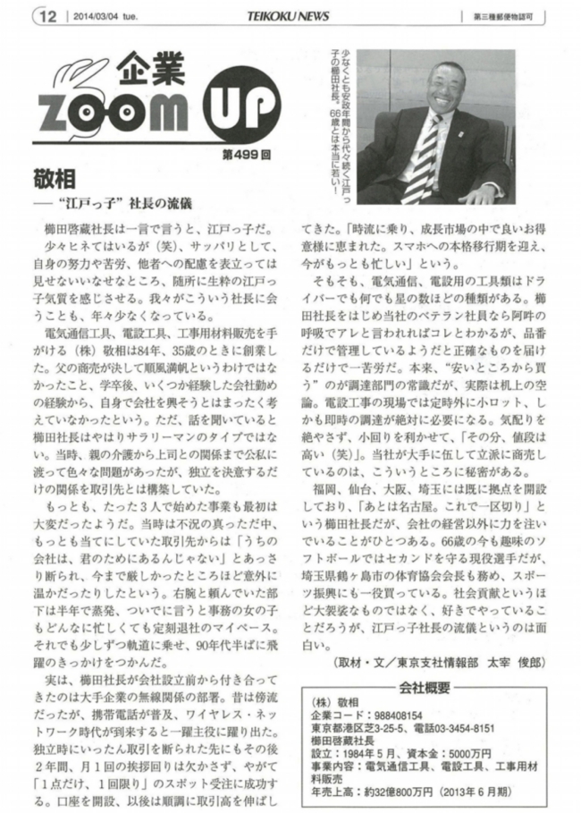 トップメッセージ お客様からの「ありがとう」に出逢うために。創業以来培ってきたノウハウをもとに、社員一丸となってお客様のニーズにお応えしています。 READ MORE 会社概要 電気通信工具及び工事材料や、電設用工具、高所作業用安全用品など、安心安全を支える製品を販売。特注品の開発にも注力しています。 READ MORE 経営理念 全社一丸となり「心ひとつに新製品の開発・販売」を心がけ、自社オリジナル製品を充実し、お客様に望まれる最新で高品質のより良い製品を。 READ MORE 沿革 1984年創業 READ MORE 事業所一覧 北海道から福岡県まで、全国の主要都市に事業所を展開しています。 READ MORE 組織図 2022年7月(40期)からの弊社の組織体制をご覧いただけます。 READ MORE